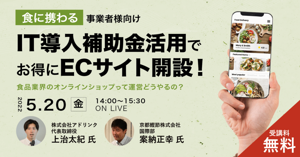2022年度IT導入補助金の支援事業者に採択されている株式会社アドリンクでは、本補助金についてのご説明や、補助金を活用してお得にオンラインショップを構築する方法を詳しくお話しします。