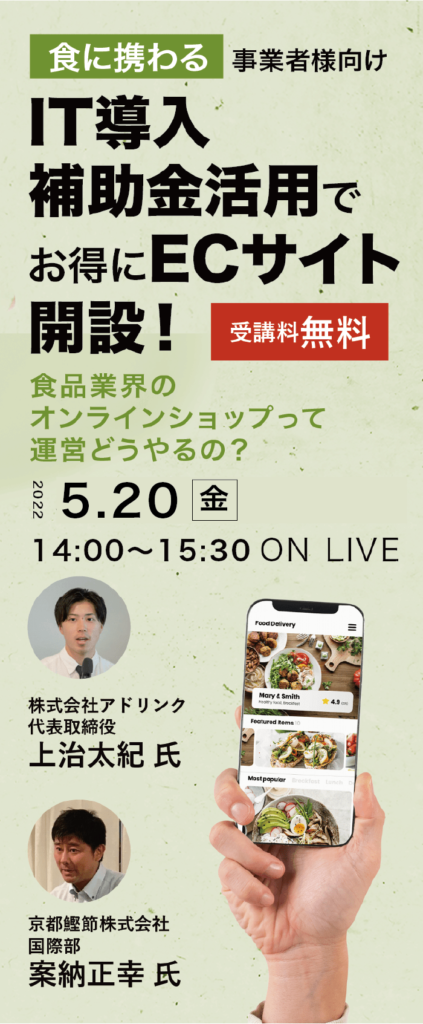 また、当セミナーでは、実際にIT導入補助金を活用してオンラインショップを立ち上げ、運用されている食品関係の事業者様を講師としてお招きし、初回申請から採択に至るまでのお話しや、オンラインショップの運営についてなど、経験者だからこそ分かるあれこれをお話ししていただきます!